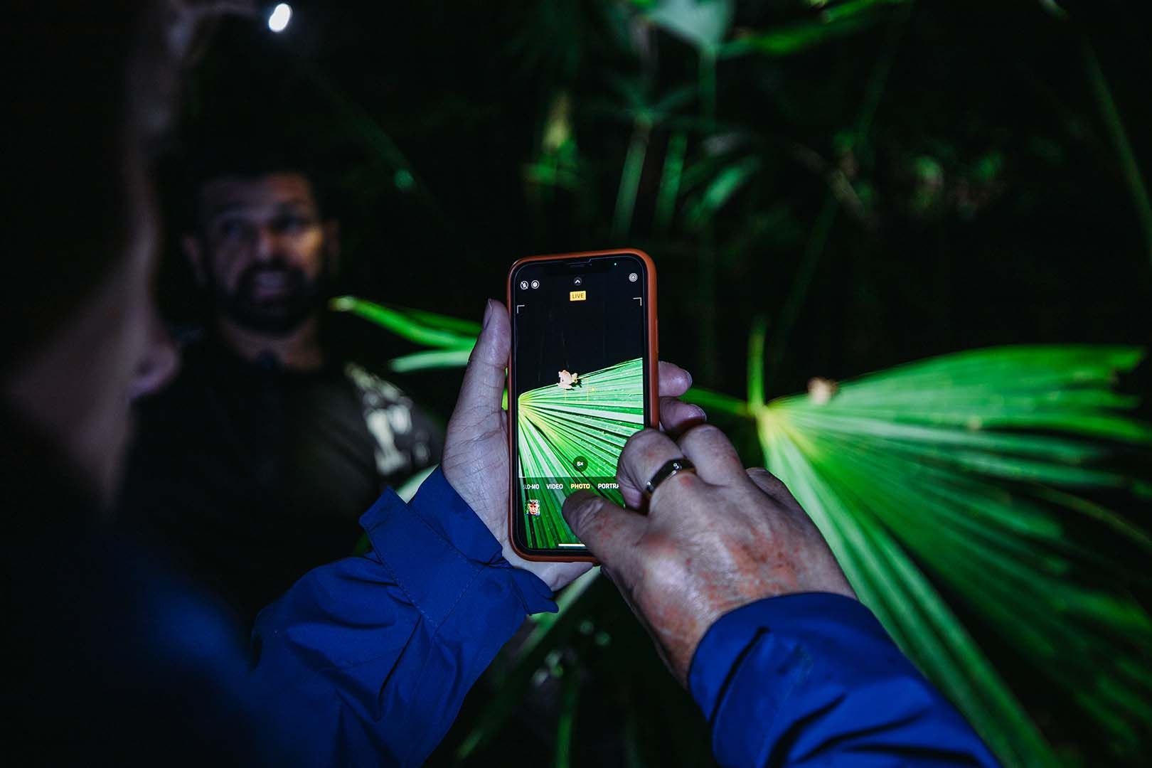 ¡Cuando se pone el sol es cuando la selva cobra vida de verdad! Podrás observar, de primera mano, una multitud de especies de ranas, lagartijas, serpientes, arañas, ciempiés, murciélagos y todo tipo de insectos en esta educativa e inolvidable excursión ecológica.